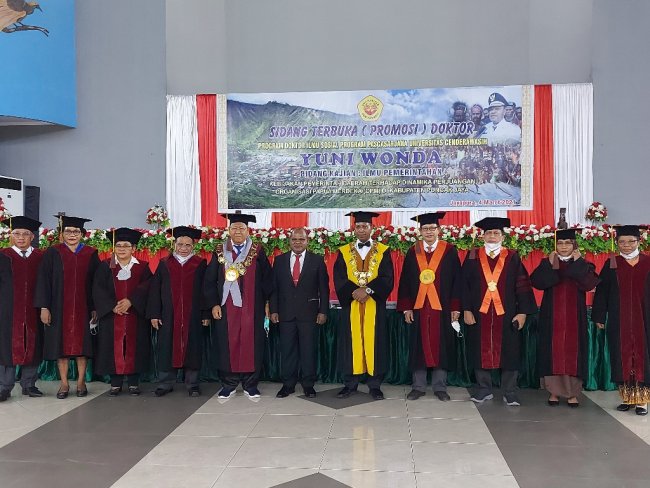 Penyematan gelar doktor ini, setelah dua jam lebih Yuni mempertahankan argumen ilmiahnya di hadapan tim penguji, promotor, tim oponen, Rektor, dan representasi Guru Besar Ilmu Sosial Universitas Cenderawsaih (Uncen), dalam sidang Doktoral yang digelar di Auditorium Uncen Abepura, Kamis (04/03).