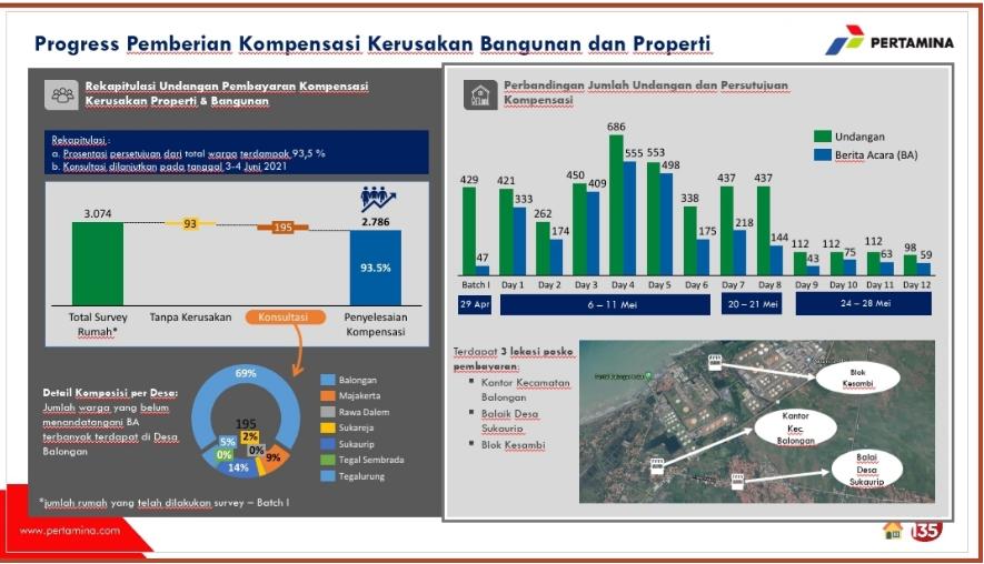 Perlu diketahui saat ini proses ganti rugi fisik terhadap warga terdampak kebakaran tangki penampungan minyak oleh PT Pertamina RU VI Balongan sudah berjalan 85 persen, dan diharapkan proses segera selasai. Data progres pemberian kompensasi kerusakan bangunan dan properti sesuai dengan grafik yang tertera.