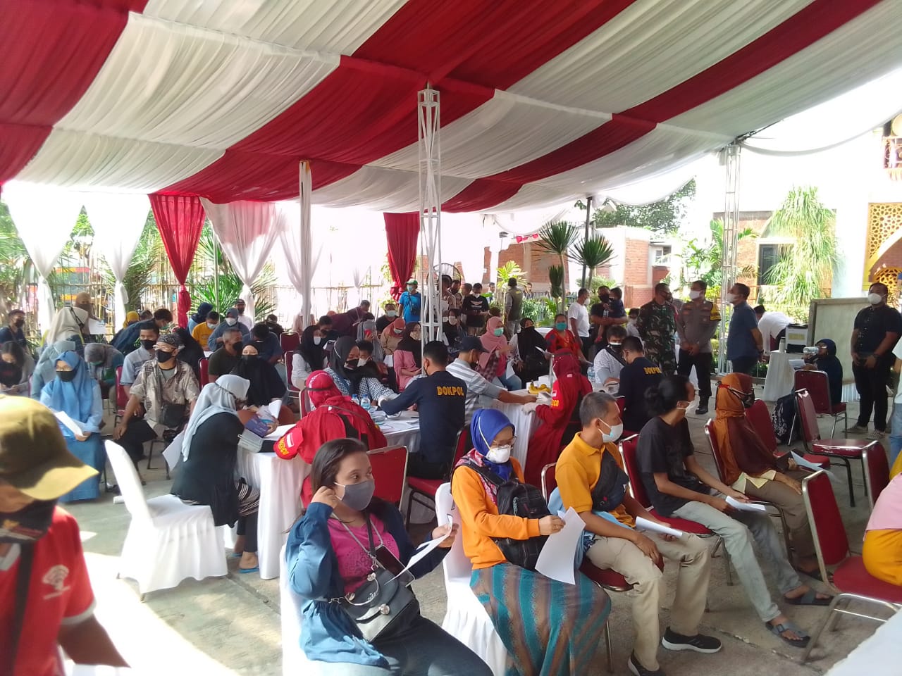 Dalam kegiatan Vaksinasi Massal Covid-19 masyarakat sekitar sangat antusias, berbondong-bondong menuju ke lokasi dari pukul 07.00 WIB.