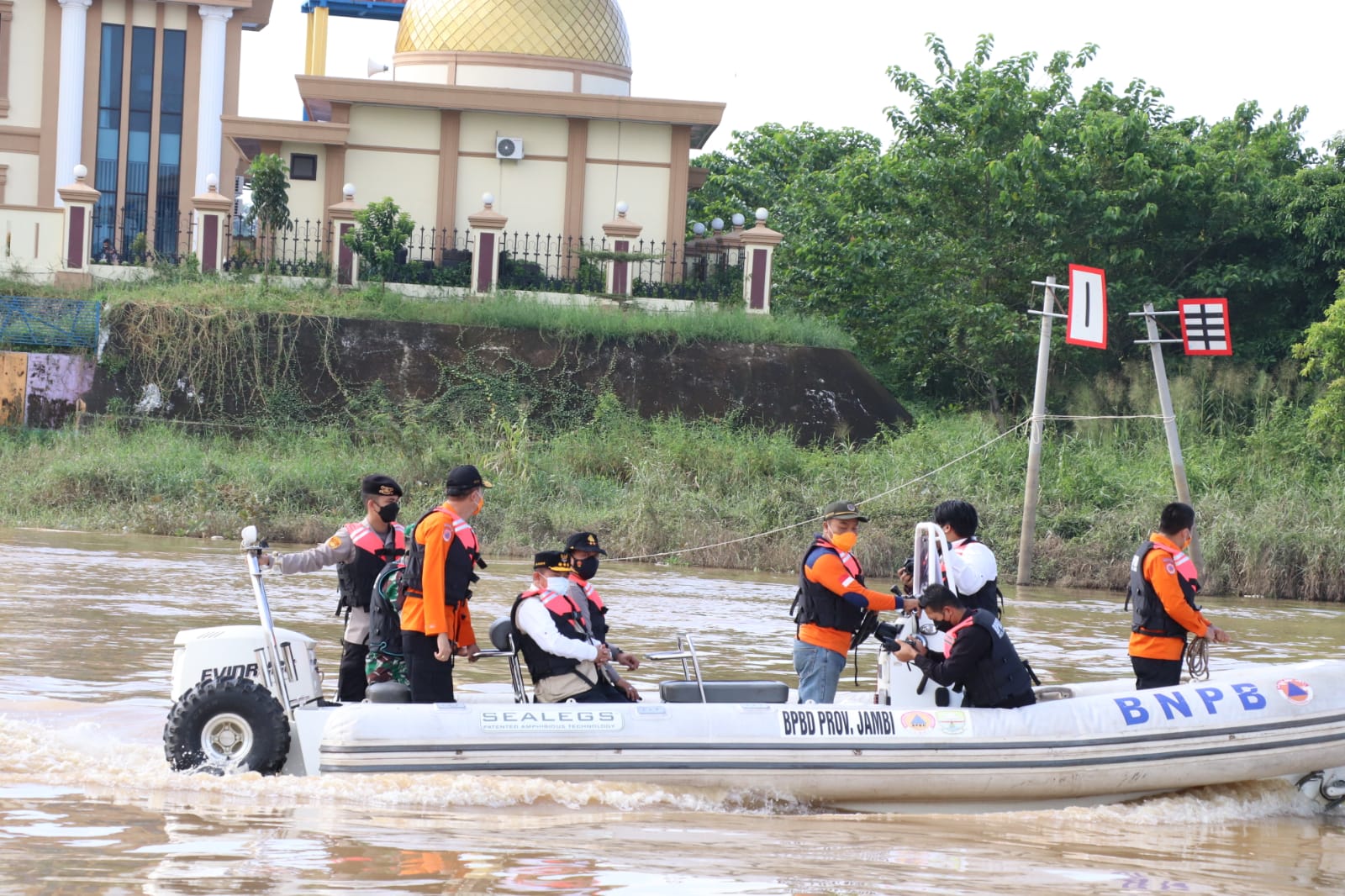 Selesai upacara, Kapolda Jambi dan Gubernur Jambi beserta rombongan melakukan peninjauan debit air sungai Batanghari menggunakan Speedboat Ditpolairud Polda Jambi dan BPBD Jambi.