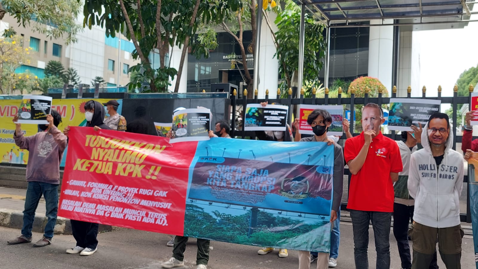 JAKARTA – Kelompok massa tergabung dalam Gerakan Satu Padu (SAPU) Lawan Koruptor Formula E menggelar aksi Jumat Keramat di Gedung Merah Putih Komisi Pemberantasan Korupsi (KPK) dan BPK DKI Jakarta, Jumat (1/4/2022).