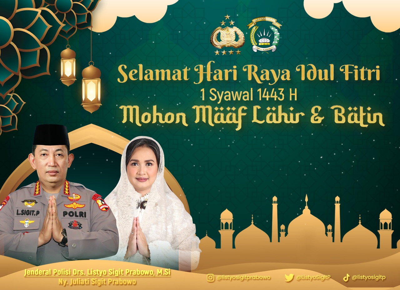 Jakarta – Kapolri Jenderal Listyo Sigit Prabowo menyampaikan selamat merayakan Hari Raya Idul Fitri 1443 Hijriah kepada seluruh umat Muslim di Indonesia. Ia berharap perayaan ini dapat dijadikan momentum untuk seluruh masyarakat kembali ke fitrah.
