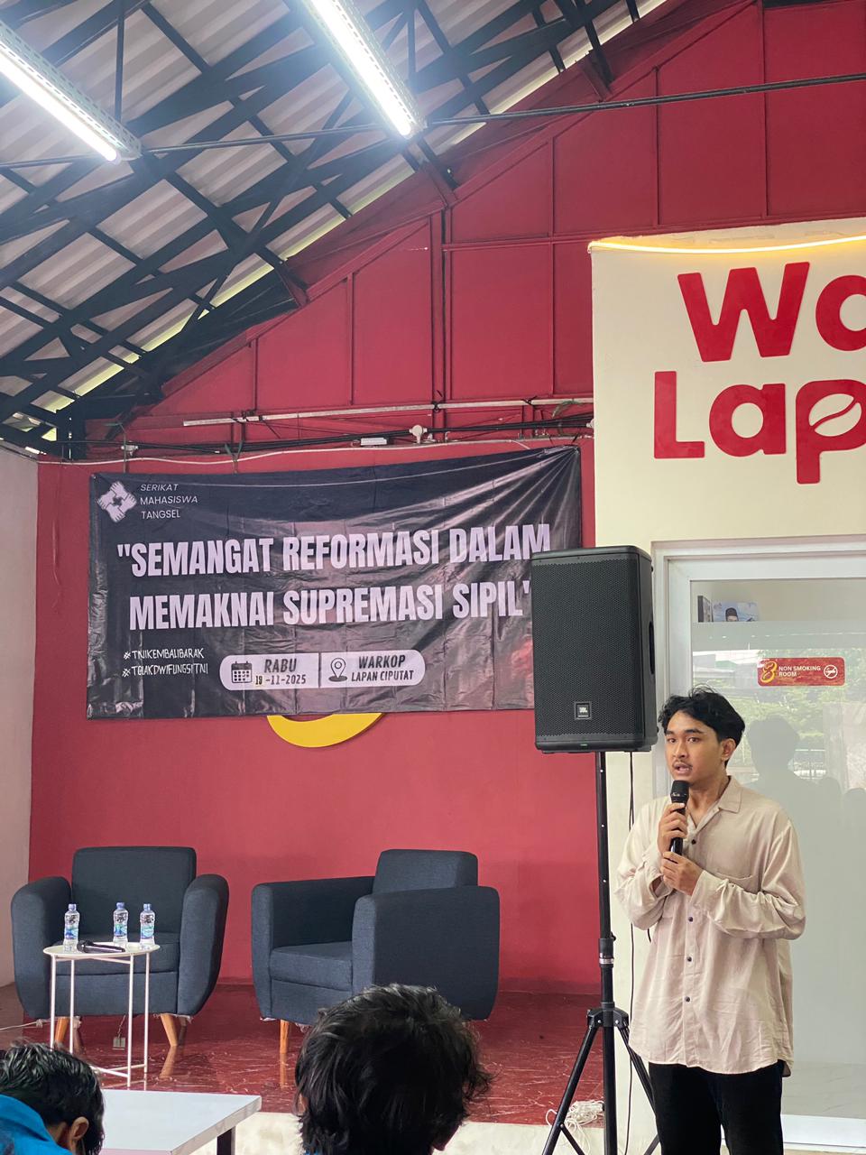 TANGSEL – Serikat Mahasiswa Tangerang Selatan menggelar diskusi publik bertema “Semangat Reformasi dalam Memaknai Supremasi Sipil” pada Rabu (19 Oktober 2025), di Warkop Lapan, Ciputat, Tangerang Selatan.